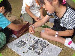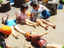 両親から離れて始めての集団生活に、どの子も心も身体も不安と緊張感でいっぱいです。そんな心や身体の堅さをいろいろな素材(水・砂・絵の具・新聞紙・ダンボール・絵本)との出会いを大切に、一人ひとりが満足のいくまでやりきることで仲間との関わりを広げています。