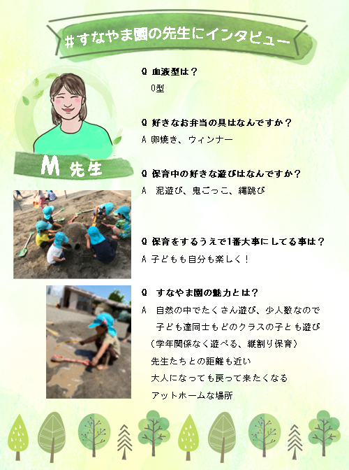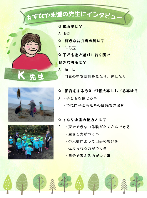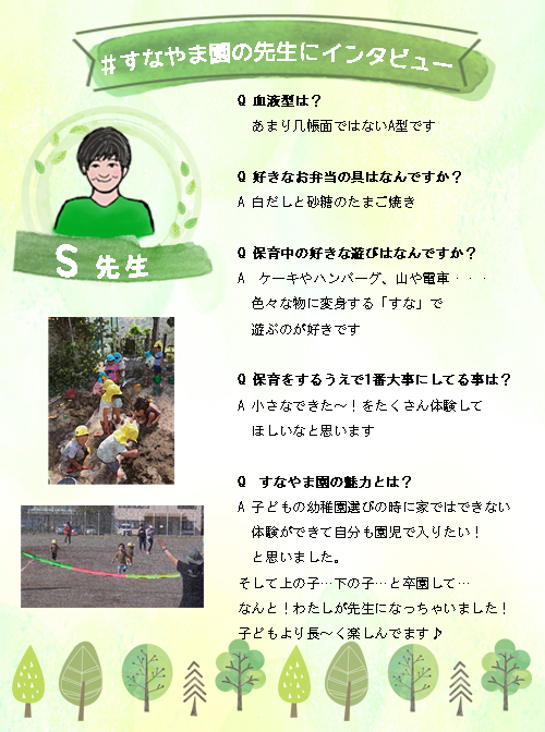 いつも素敵な保育をしてくださるすなやま園の先生方にインタビューしました。